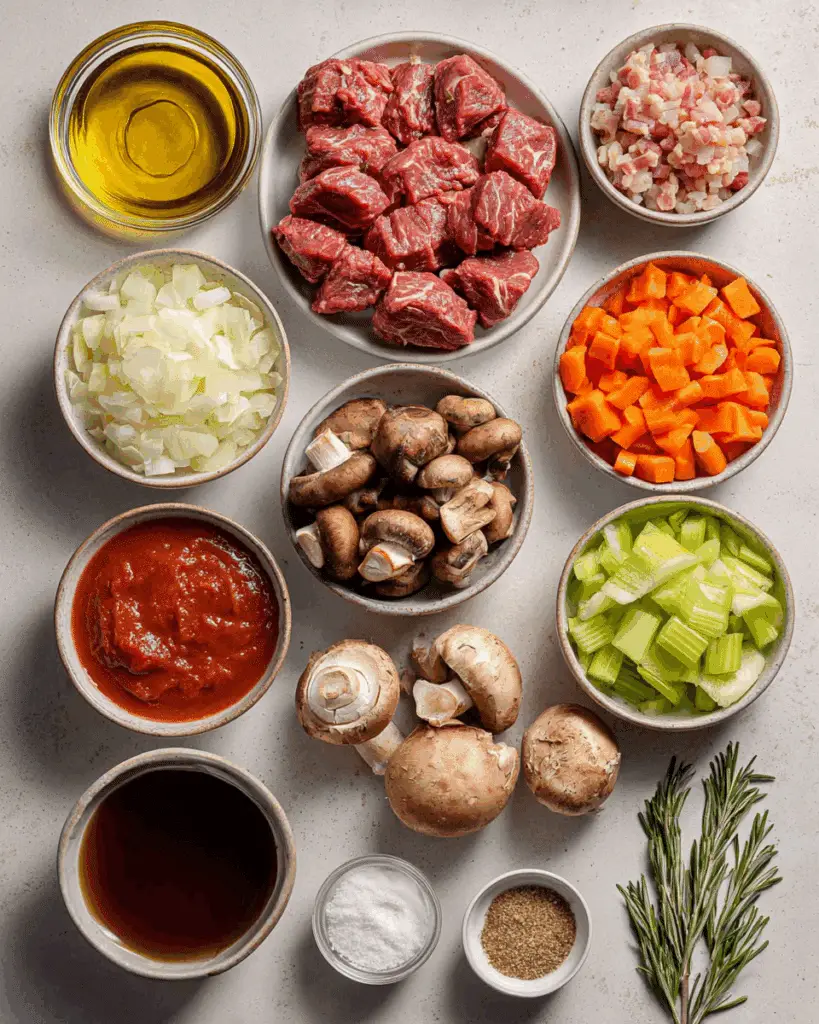 A rich and hearty Italian beef stew made with tender chuck steak, pancetta, vegetables, mushrooms, and a savory red wine and tomato sauce, perfect for a comforting meal.