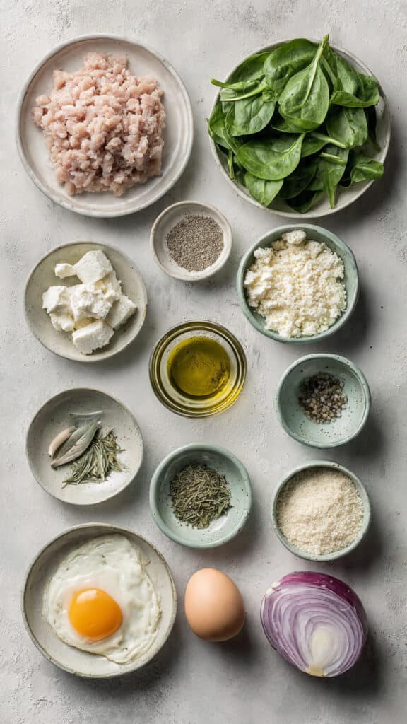 - In a large bowl, combine ground chicken, chopped spinach, crumbled feta, minced garlic, diced red onion, egg, breadcrumbs, dried oregano, salt, and black pepper. Mix gently until just combined.