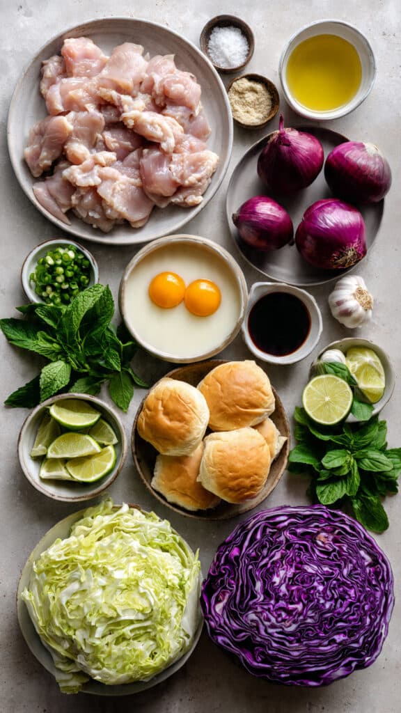 Crispy fried chicken thighs topped with tangy Thai slaw, fresh herbs, and creamy mayo, all tucked inside soft potato buns. A flavorful fusion of Southern comfort and Thai zest in every bite.