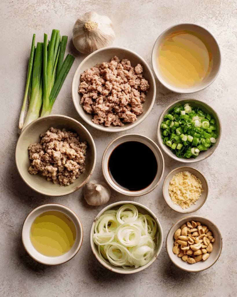 - Heat peanut oil in a skillet over medium heat. Add ground pork and cook until browned, about 3–4 minutes.