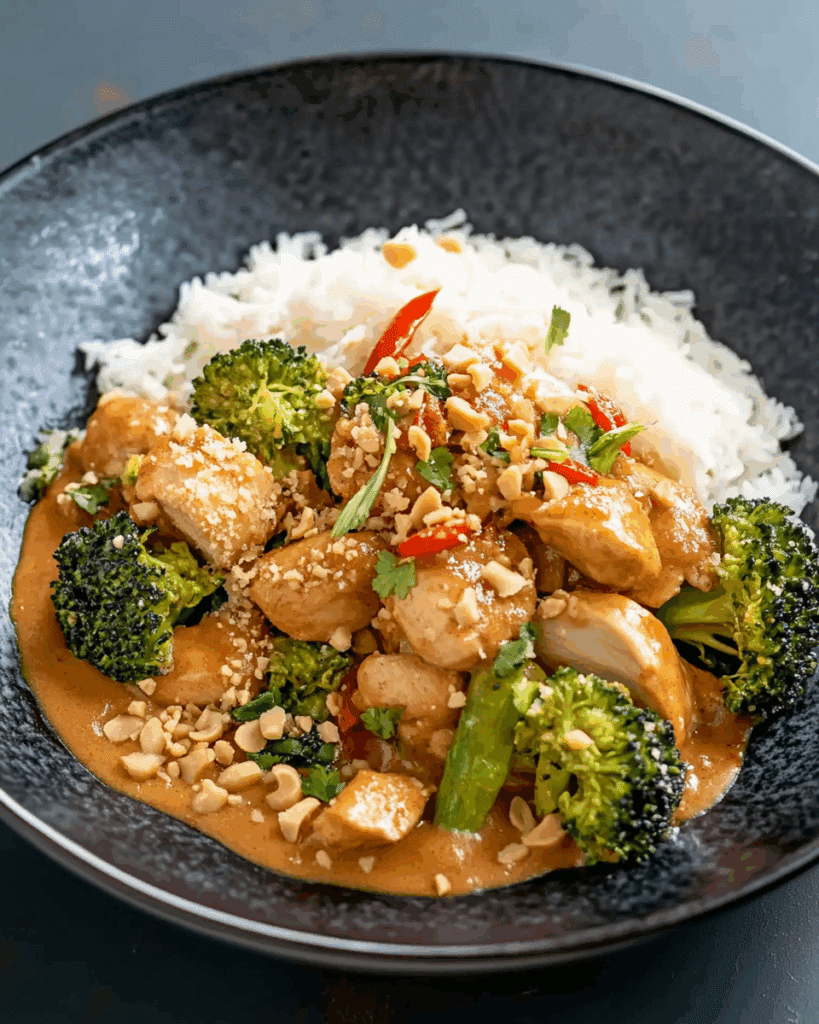 Thai Peanut Chicken is a flavorful, easy-to-make dish that combines tender chicken strips with a savory peanut sauce, served over rice with vibrant broccoli, garlic, ginger, and crunchy peanuts for added texture.