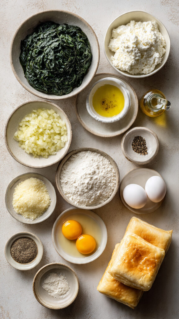 - Frozen Spinach (leaves): 12 ounces, thawed and squeezed dry. Adds earthiness and depth to the filling.