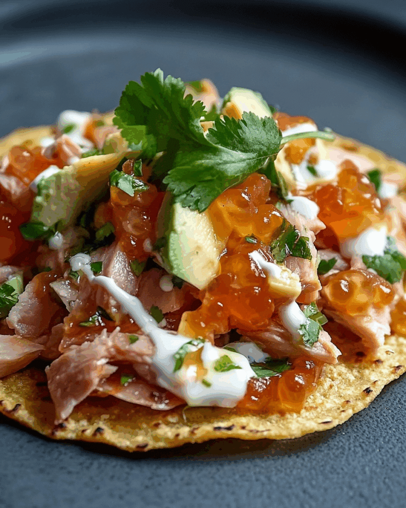 Tuna Tostadas are a quick, fresh, and flavorful meal made with canned tuna, sweet corn, cilantro, and lime, all piled onto crispy tostada shells. Topped with sour cream and a splash of hot sauce, this dish is a perfect blend of light, savory, and tangy flavors.