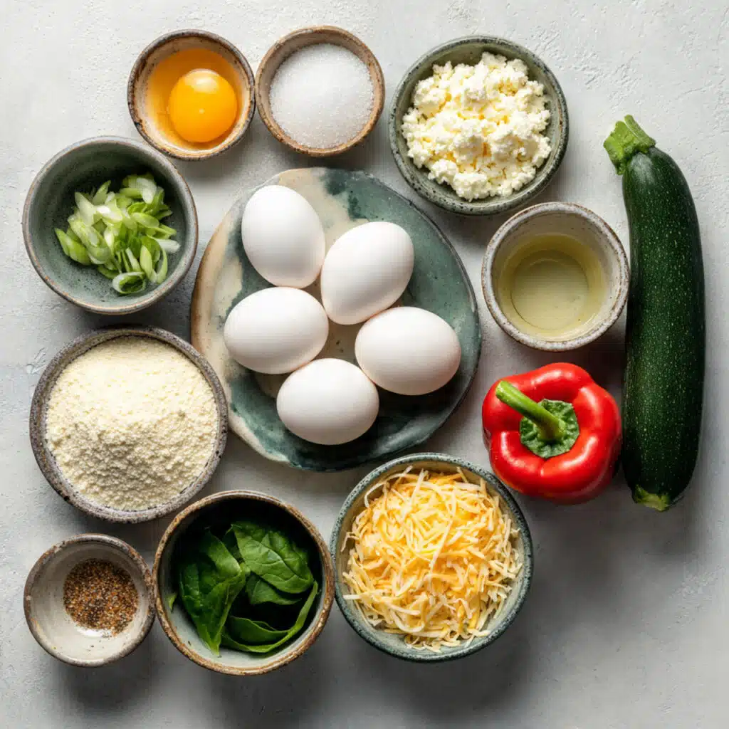 - Combine Ingredients: In a large bowl, whisk the eggs, cottage cheese, almond flour, baking powder, garlic powder, onion powder, salt, and black pepper until smooth. Stir in the shredded cheddar, zucchini, chopped spinach, diced red bell pepper, and green onions.