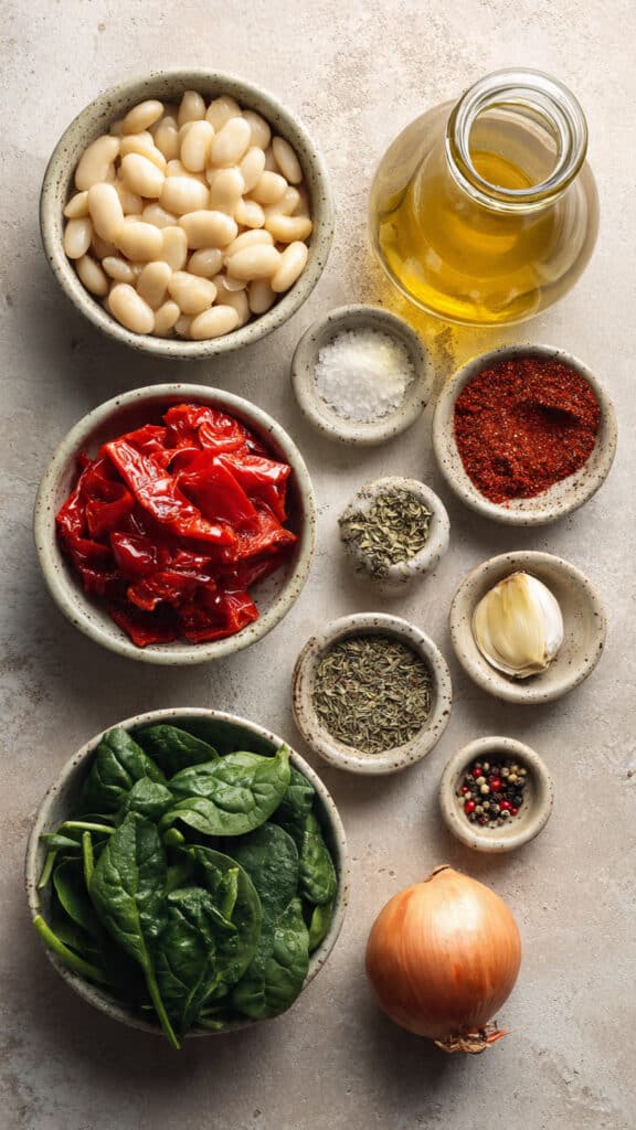 A comforting and nourishing soup made with creamy white beans, sweet roasted red peppers, tender spinach, and aromatic herbs simmered in a savory vegetable broth.