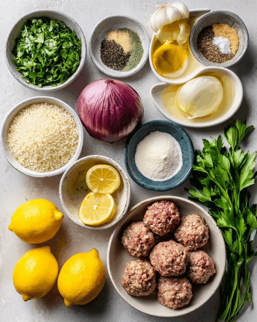 For the Meatballs: Ground beef, Arborio rice, grated onion, egg, parsley, mint, kosher salt, black pepper, and olive oil. These ingredients come together to form tender, aromatic meatballs that simmer gently in the broth.